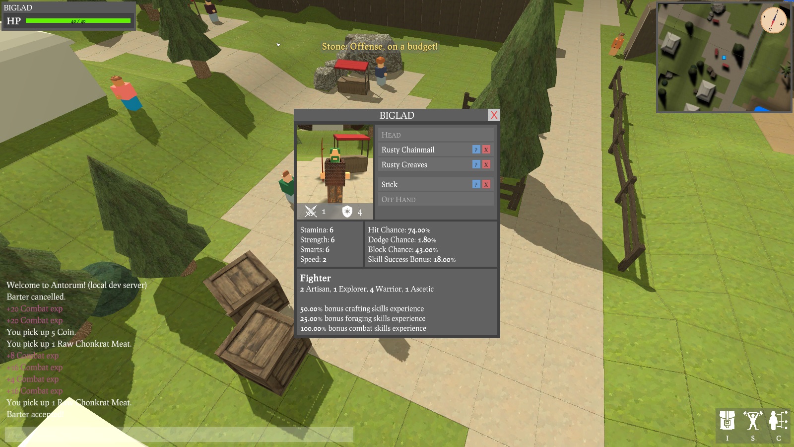 Included in these changes are a slight rework to character stats, and the introduction of classes. In Antorum, players select a class by allocating class points into four areas: Artisan, Explorer, Warrior, and Ascetic. These points determine the name/title of the class and experience bonuses in the various skill categories, so you can tailor your character to be a bit better in the areas that suit your playstyle. I'll see how this all feels as work on the game continues.