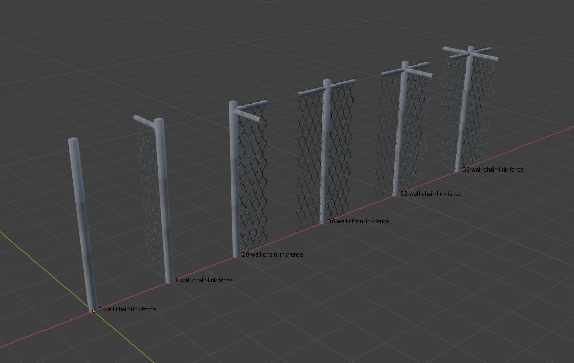 A wall mesh is built out of a few different individual pieces. The game uses these and creates mesh resources for all their possible orientations. Then, they are stitched together at runtime. To decide which piece to use, I sum up the neighboring walls that exist to get a sort of "neighbor score". Then, each potential score is mapped to the proper piece. It's a technique I learned from this cool Blob Tileset article on cr31.co.uk.