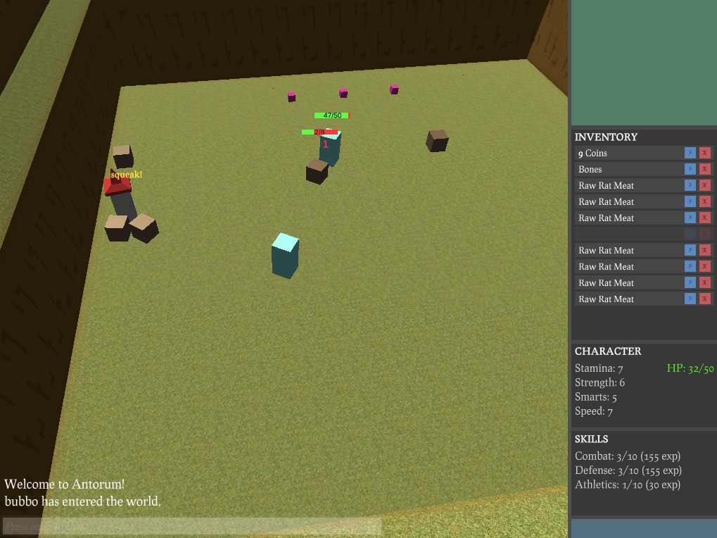 This week I worked on adding items and the inventory to the game. It's not perfect, so I'll probably spend a bit more time tweaking it while I figure out what the next feature is going to be. You can pickup, drop, and examine items. There's no way to trade with other players yet, but one player can drop items for others to pick up. As with the rest of the player data, inventories are stored in the database, and getting that working was one of the most interesting challenges so far. Of all the state in the game, the inventory has the most complex, so it really tested the database and network syncing code. So far it seems to be holding up, but I am getting a lot of insight as to how I plan on designing the codebase for the next multiplayer game I work on. With this update, there are now 24 packets in the game protocol.