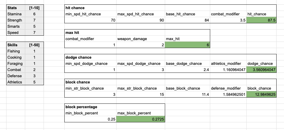 I did some more tweaking for combat formulas as well. This is totally new territory for me, so I'm not sure how balanced it will feel as time goes on. I've been using a nifty spreadsheet to work on this stuff, and it isn't too hard to try out new values.