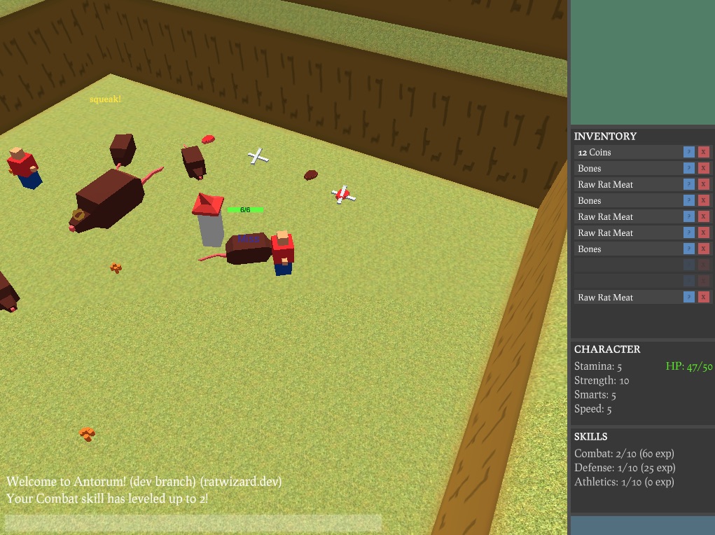 There's more bugs to fix, and some more refactoring I need to do before I add any new features (I'm trying to avoid broken windows in the codebase). If I finish that stuff up, then a stretch goal for this month is to get some actual terrain into the game, and fix up the movement system so characters can properly traverse it. I'm sick of fighting giant rats in this tiny pit.