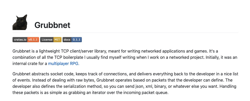 The rest of my time was spent working on and quietly publishing the Grubbnet crate, which is the same networking crate that the Antorum game server uses under the hood. It is only an initial version, so I need to work on documentation, improved examples, and cleaning up the API a bit. For now, though, it's available for use by other Rust game developers.